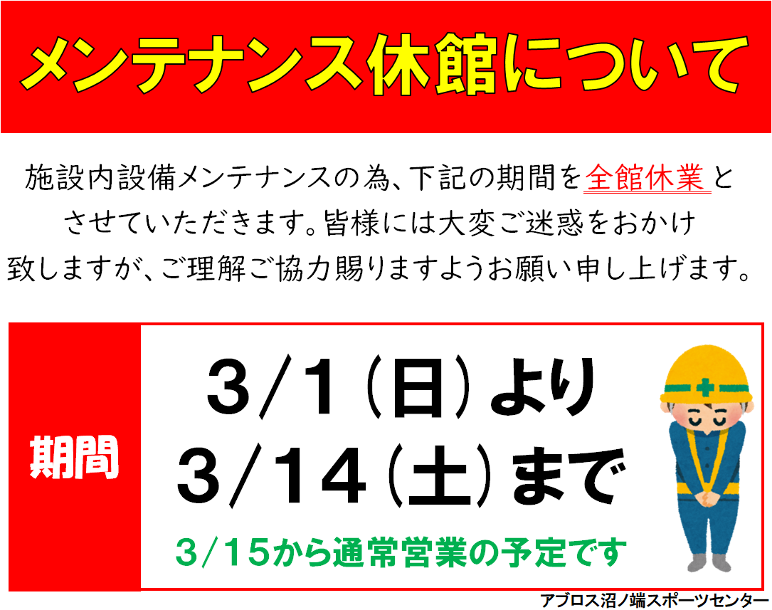 施設メンテナンスの為、下記の通り『全館休業』とさせていただきます。 ご不便をお掛け致しますがご理解賜りますようお願い申し上げます。