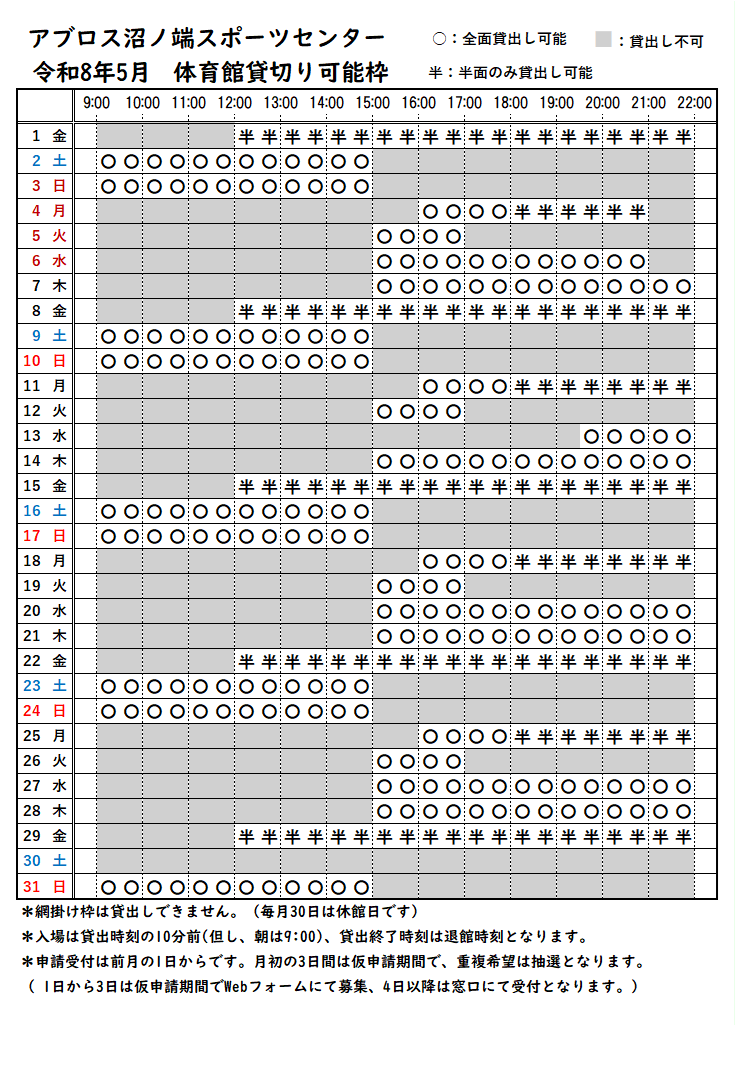 ※毎月1日~3日は抽選の募集期間です、webフォームにて承ります、フォーム内の案内を確認後応募して下さい。4日以降は窓口で先着順受付となります。