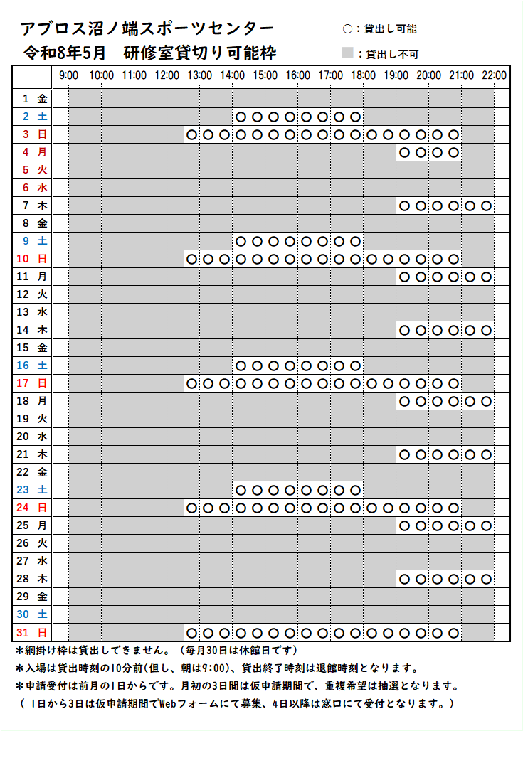 ◆◇◆ 令和8年5月の貸切り可能枠 ◆◇◆