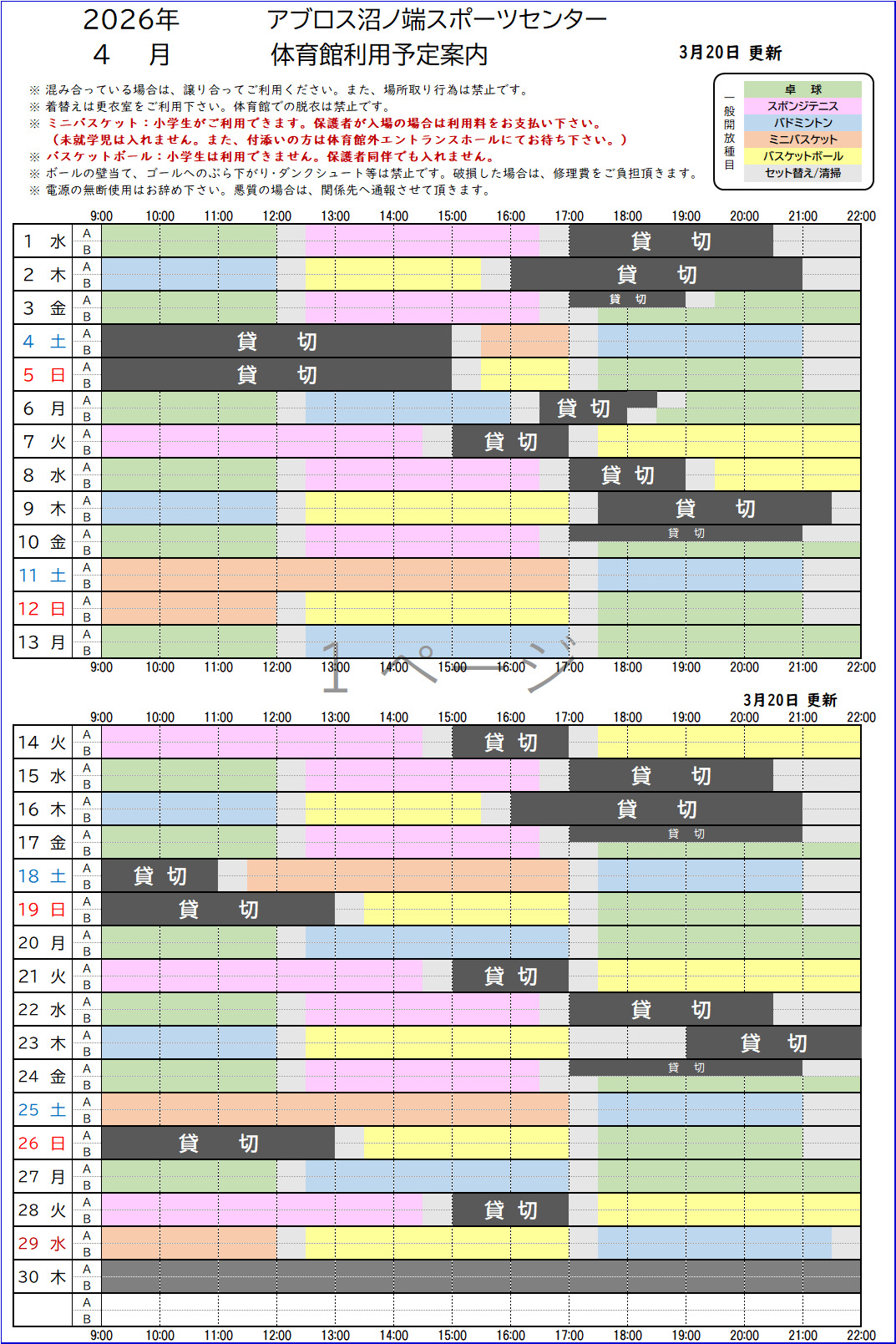 貸切りがない場合は、割当一覧表に準じて開放致します。